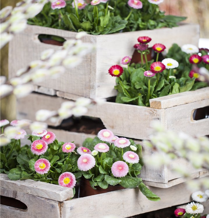 Das Gänseblümchen (Bellis perennis) ist eine rosettenartige Staude, die von Februar bis November rosafarbene, rote oder weiße Blüten bildet. An einem sonnigen bis halbschattigen Standort mit durchlässigem, nährstoffreichem Boden erreicht es gewöhnlich eine Höhe von ca. 20 cm und wird ca. 20 cm breit. Das Gänseblümchen ist gut frostverträglich.