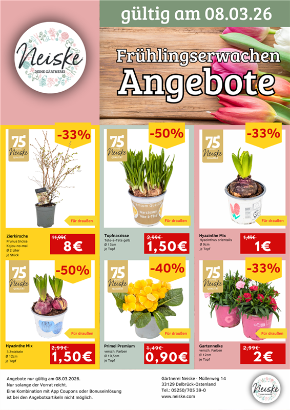 Wir, die Gärtnerei Neiske, laden dich herzlich ein, den Frühling am Sonntag, den 8. März 2026, mit uns zu begrüßen. Freu dich auf ein farbenfrohes Event voller Inspiration, besonderer Angebote und kulinarischer Genüsse!