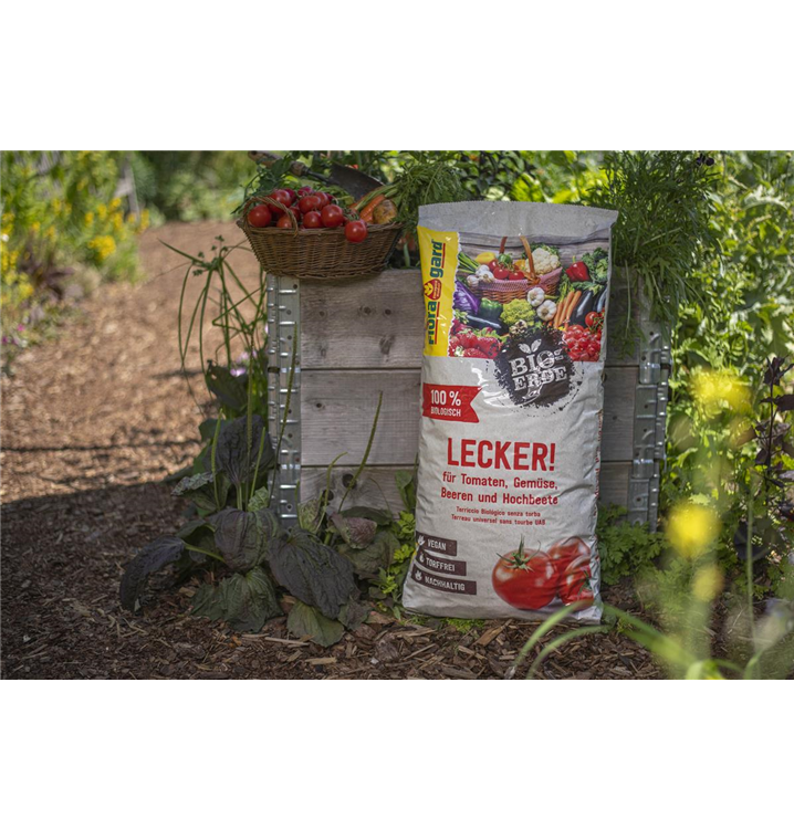Die Floragard Bio-Erde LECKER! Doch warum „lecker“? Du stehst auf natürlichen und unverfälschten Geschmack? Du liebst es, deinem liebevoll gepflegten Gemüse beim Wachsen zuzusehen? Diese torffreie und vegane Bio-Erde kannst du für alle Gemüsepflanzen verwenden – egal ob im Gewächshaus, im Beet oder im Kübel. Wenn der Tag der Ernte gekommen ist und du dein eigenes Gemüse genießt, dann heißt es: Ist das lecker! Ideal für köstliches und gesundes Bio-Gemüse wie Tomaten, Auberginen, Paprika, Chili oder Zucchini aus eigener Ernte. Auch für Salat, Knoblauch, Zwiebeln, Beerenobst und Säulenobst geeignet. Natürlich und vegan – unbedenklich für Mensch und Tier Natürlichkeit ist dir wichtig? Dann hast du dich für die richtige Erde entschieden! Die Floragard Bio-Erde Lecker besteht zu 100 % aus natürlichen Rohstoffen. Für 4 bis 6 Wochen versorgt der vegane Bio-Dünger Flora Veggie Power deine Obst- und Gemüsepflanzen mit allen wichtigen Nährstoffen – das bedeutet gesundes Wachstum und eine reiche Ernte, alles ohne tierische Inhaltsstoffe. Der vegane Dünger darf auch im biologischen Landbau sowie im kontrolliertem ökologischem Land- und Gartenbau angewendet werden. Deswegen ist diese Erde unbedenklich für dich, deine Familie, deine Haustiere und die Tiere in deinem Garten.