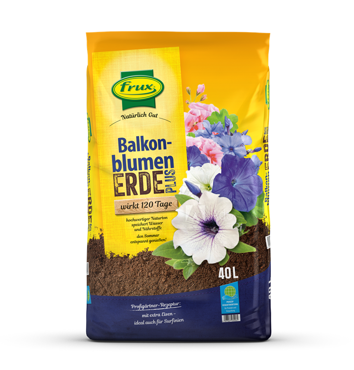 Die Balkonblumenerde Plus – mit Depotdünger ist ein gebrauchsfertiges Kultursubstrat, das genau auf die Bedürfnisse Ihrer Geranien, Petunien und anderer Balkonpflanzen abgestimmt ist. Durch den hohen Anteil an Naturton und die Verwendung von hochwertigen Torfersatzstoffen und Torf mit optimaler Struktur garantiert diese Erde eine sehr gute Wasser- und Nährstoffspeicherung. Die Erde bleibt vergießfest, atmungsaktiv und gibt durch den hohen Tonanteil Wachstums- und Blühsicherheit auch während länger dauernder Hitze- und Nässeperioden. frux Balkonblumenerde Plus enthält Vorratsdünger für 120 Tage und alle für das Pflanzenwachstum notwendigen Nährstoffe. Durch diese Grundversorgung wird das Wachstum der Balkonpflanzen optimal gefördert und ihre Pflege erleichtert.