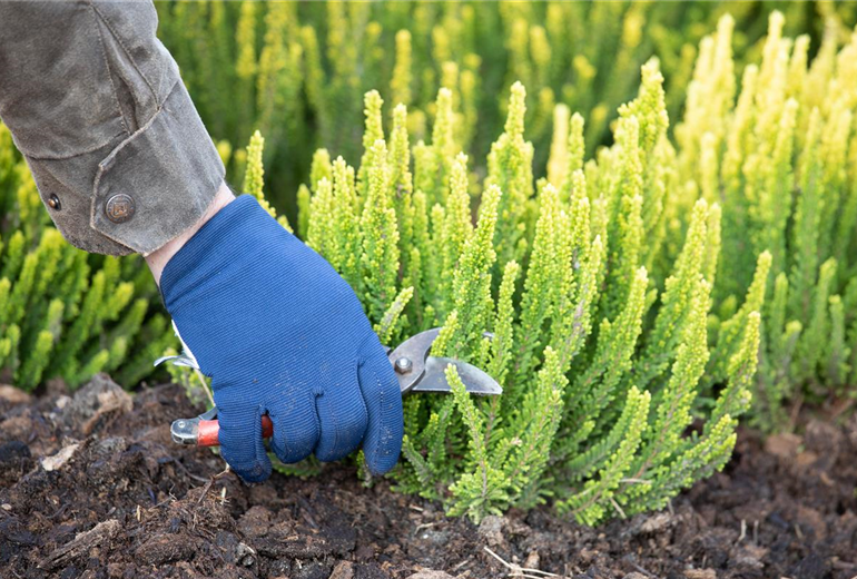 Damit das Heidekraut lange gut aussieht und Freude macht, sollte man die Heide pflegen. Sind die örtlichen Bedingungen gut, wird das Heidekraut gut gedeihen und kräftig wachsen. Daher ist ein regelmäßiger Schnitt beim Heide pflegen wichtig. Wird die Erika im Frühling geschnitten, wird die Sommerheide umso stärker austreiben und mit vielen Blüten erfreuen. Es kann aber auch noch beim Heide pflegen nach der Blütezeit geschnitten werden. Der Rückschnitt fördert nicht nur den Wuchs, sondern verhindert auch kahle Stellen im unteren Bereich, welche die Optik beeinträchtigen würden. Der Umfang des Rückschnitts orientiert sich dabei immer an der Sorte, da diese unterschiedlich stark wachsen können, was beim Heide pflegen und schneiden zu berücksichtigen ist.