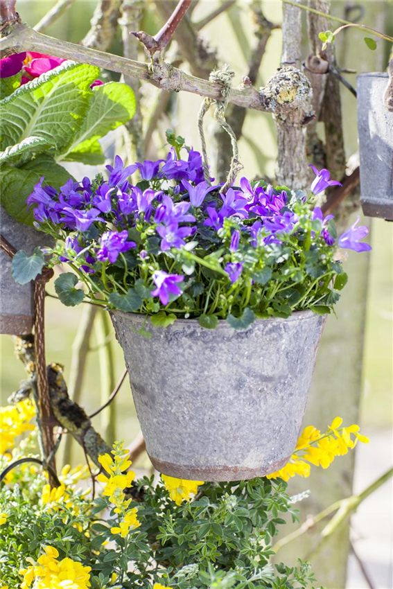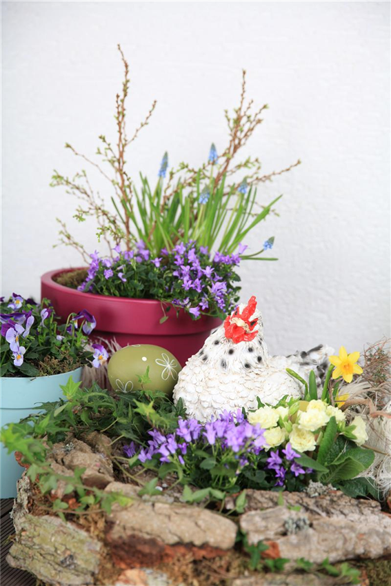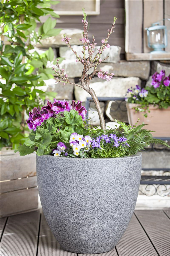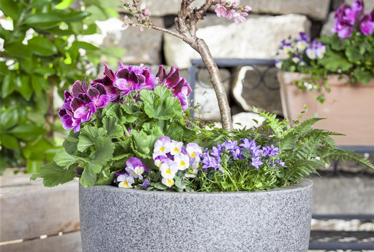Sobald etwas mehr Platz gegeben ist, wird die Basis ausgebaut. Man greift zum Schubladenystem, das man selbst aus verschiedenen Kästen zusammenstellt. Dazu kann man Blumenkästen nutzen oder seiner Gestaltungskunst freien Lauf lassen. Hauptsache, es entsteht keine flache Wand, sondern ein Gebilde mit Vorsprüngen und verschiedenen Ebenen. Nun gilt es wieder, das Ganze mit Pflanzen und Dekor zu füllen. Dabei immer bedenken: Fast alles, was es in Groß gibt, kann man auch im Kleinen ziehen. Man greift eben nicht zu Blühern mit Riesenflor, sondern zu reizvollen kleinen Blüten, man zieht keine großen Tomaten, sondern Kirschtomaten, man pflanzt keinen Baum, sondern einen Bonsai. Das Ergebnis ist kreativ und beglückend! Außerdem ohne viel Knien und Bücken, wie es im Garten so oft erforderlich ist.