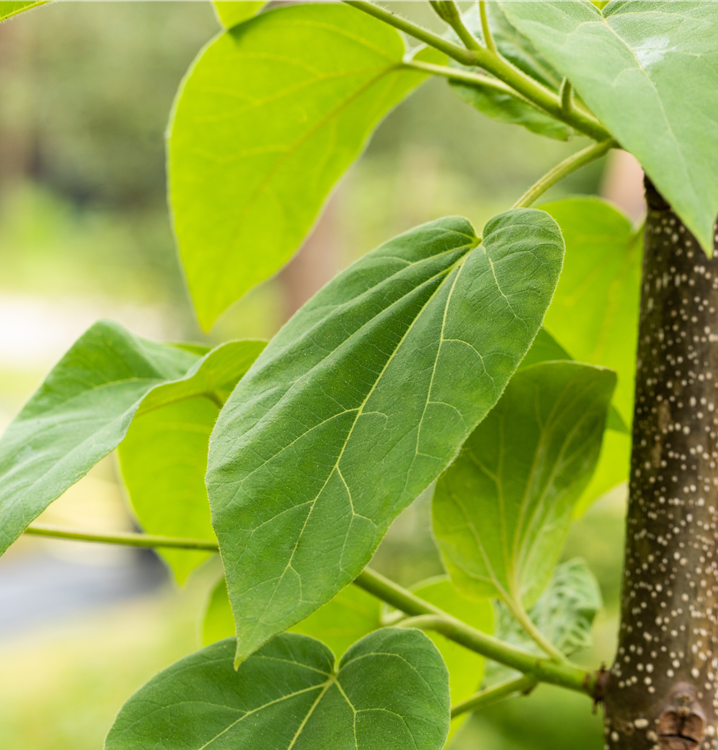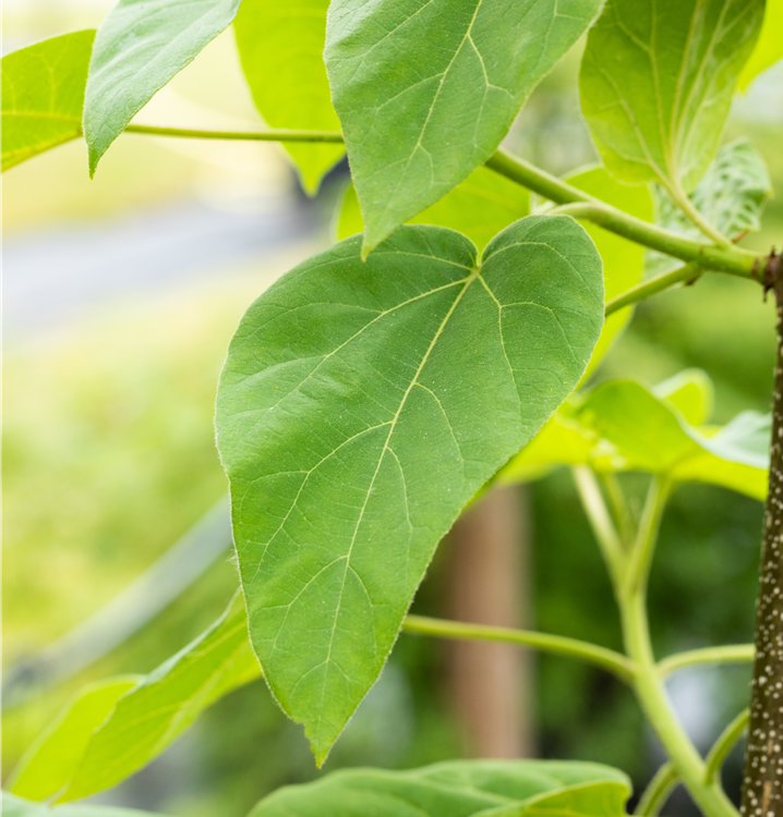 Die sommergrünen Blätter des Blauglockenbaums sind mittelgrün, herzförmig, behaart, gegenständig.