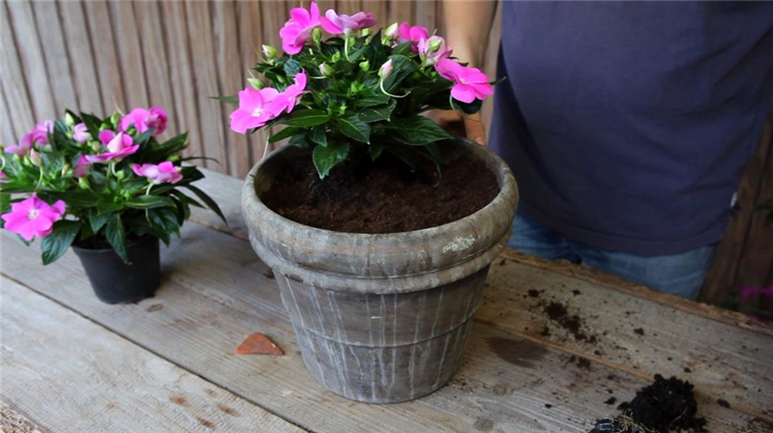 Bevor Sie handelsübliche Blumenerde in den Topf füllen, sollten Sie das Loch aber leicht bedecken: Zum Beispiel mit einer Tonscherbe. Diese verhindert, dass das Abzugsloch verstopft.