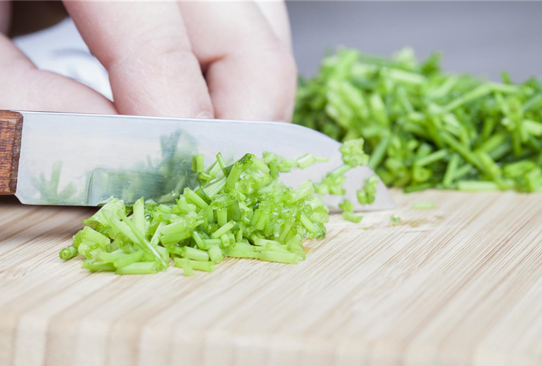 Die Herstellung ist denkbar einfach: Sie zerkleinern die frischen oder trockenen Kräuter mit Hilfe eines Pürierstabs oder Mixers und geben etwa 4 Teile Salz dazu. Das Salz entzieht den Kräutern das Wasser und trocknet sie so auf natürliche Weise. Füllen Sie sie in ein Glas- oder Keramikgefäß.