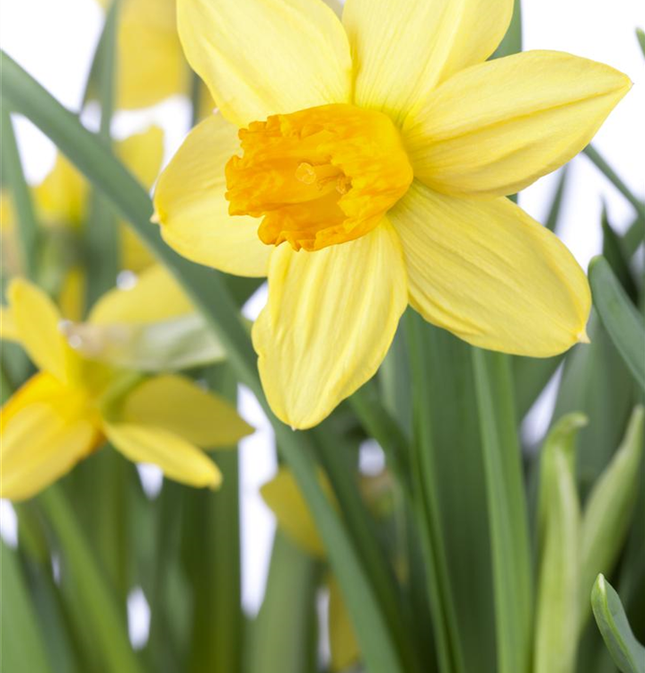 Die zweifarbigen, radförmigen oder röhrenförmigen Blüten der Alpenveilchenartigen Garten-Narzisse 'Jetfire' erscheinen in Trauben im März.