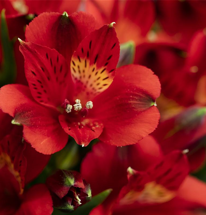 Alstroemeria 'Inticancha® Doba' bildet trichterförmige, rote Blüten ab Mai.