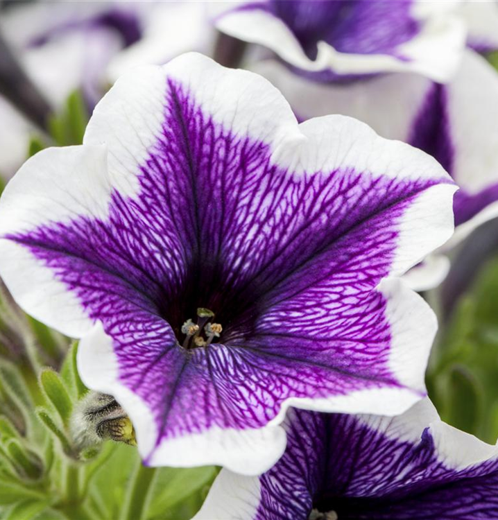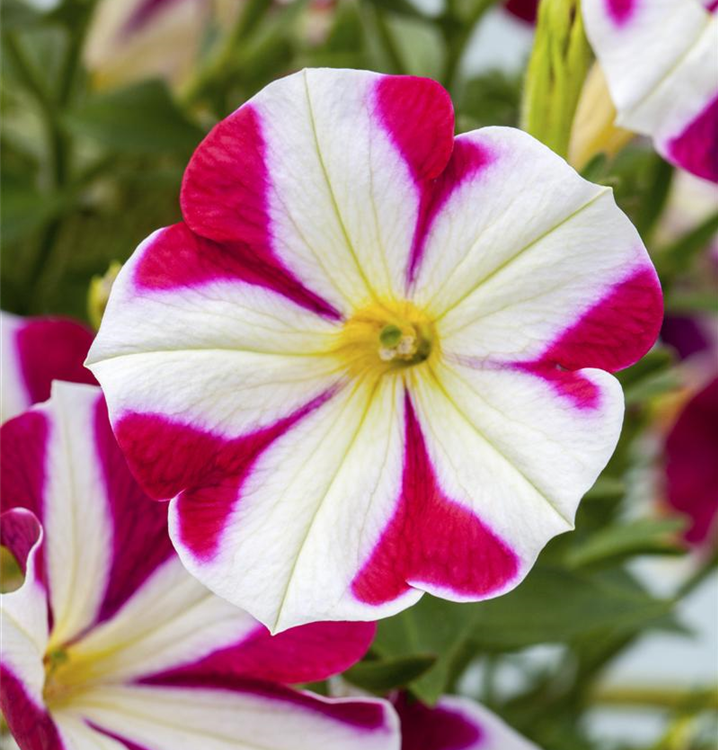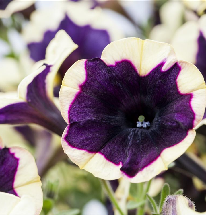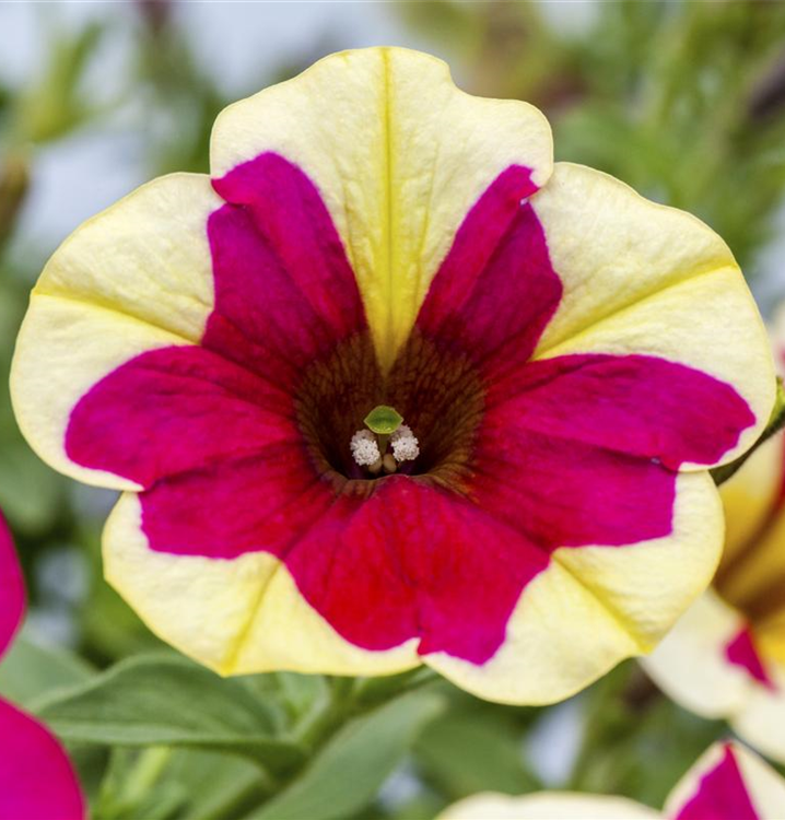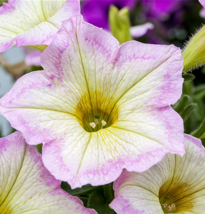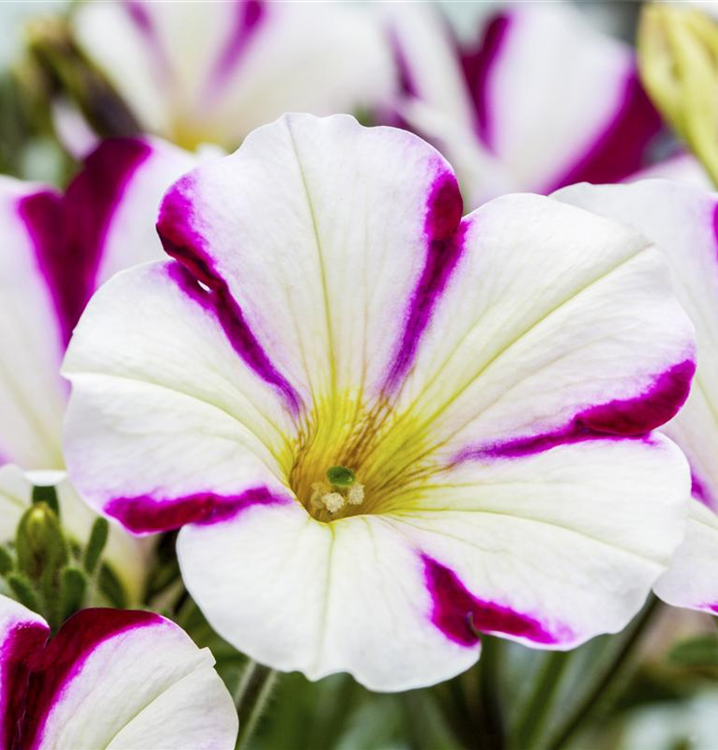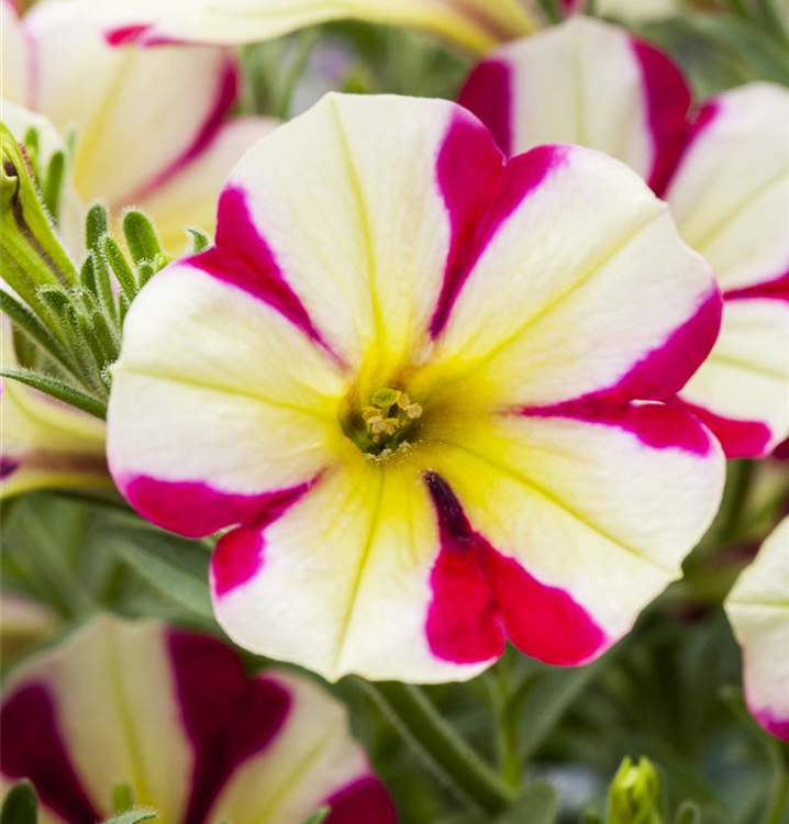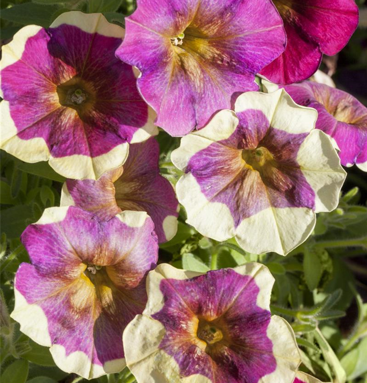 Petunia 'Chameletunia'® bildet während der gesamten Saison zahlreiche trichterförmige, bunte Blüten.