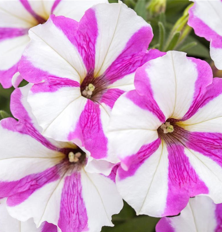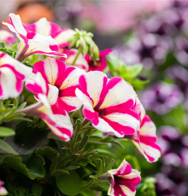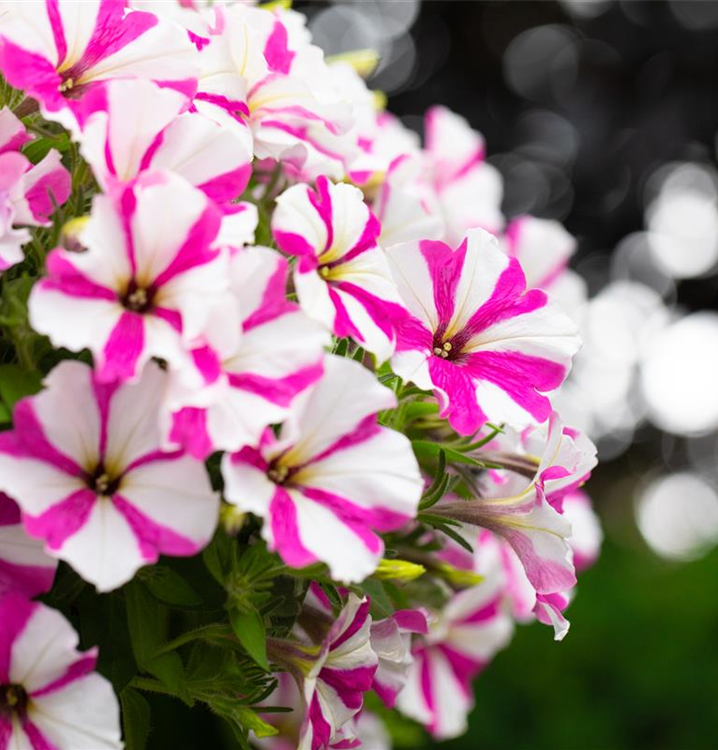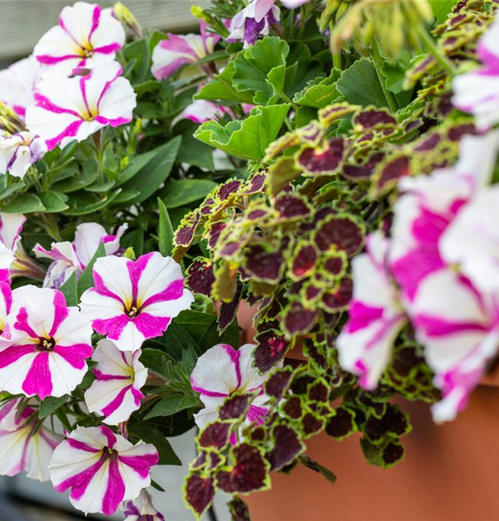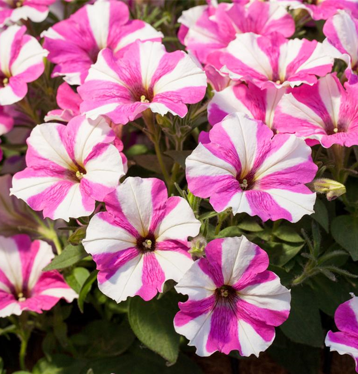 Die Petunie 'Surprise Pink Star' (Petunia) ist eine beliebte Pflanze für den Balkon. Die unzähligen Blüten erscheinen, je nach Sorte, in verschiedenen Farben die ganze Saison hindurch. Ein sonniger Standort und ein durchlässiges Substrat werden bevorzugt.