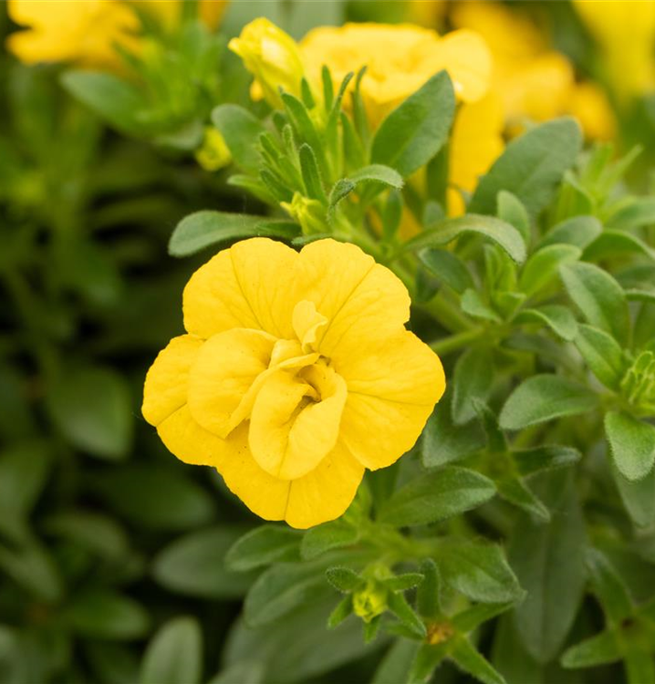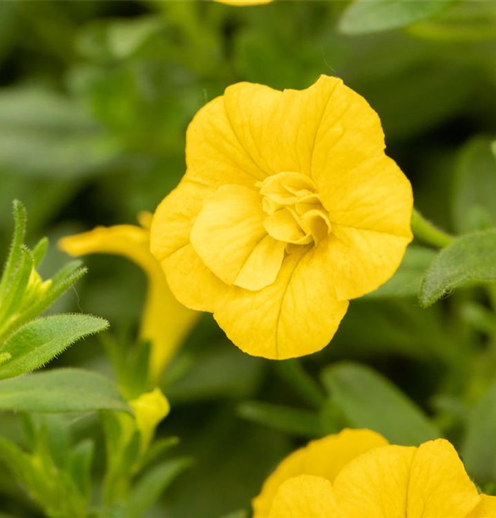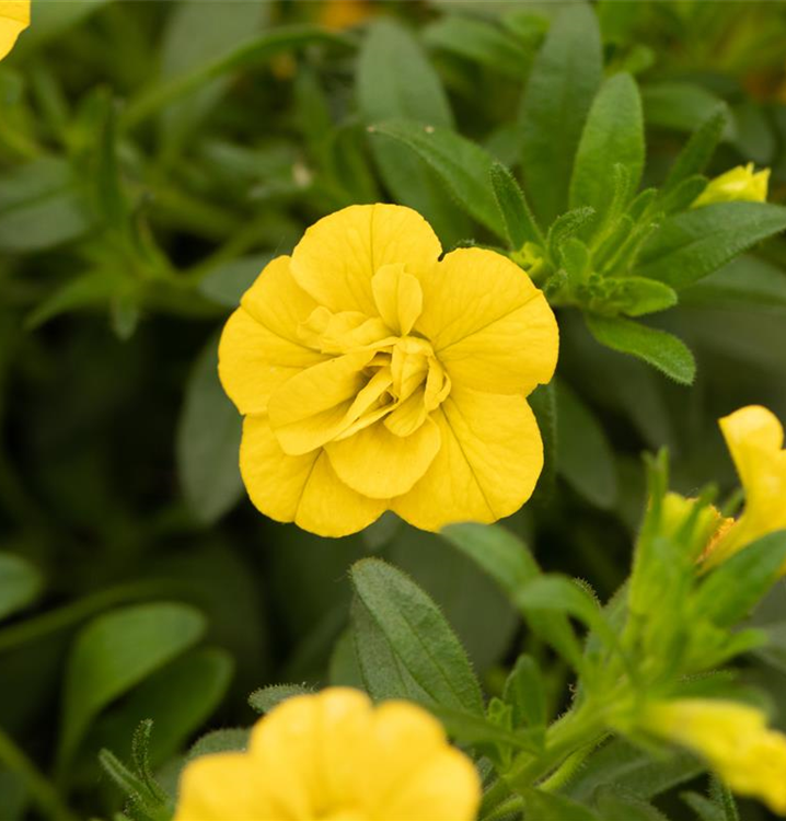 Calibrachoa 'Celebration® Double Yellow' bildet während der gesamten Saison zahlreiche gefüllte, trichterförmige, gelbe Blüten.