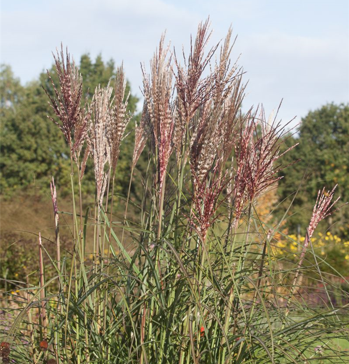 Das Garten-Chinaschilf 'Dread Locks' (Miscanthus sinensis) ist mit seiner mittelgrünen Blattfärbung ein dekoratives Gestaltungselement im Garten, welches sich an einem sonnigen bis halbschattigen Standort mit einem möglichst durchlässigen, humosen, nährstoffreichen Boden am wohlsten fühlt. Die rot-braunen Blütenwedel schmücken die aufrecht wachsende Pflanze ab Sommer. Bei günstigen Bedingungen erreicht dieses winterharte Gras eine Höhe von ca. 1,6 m und wird bis zu 80 cm breit.