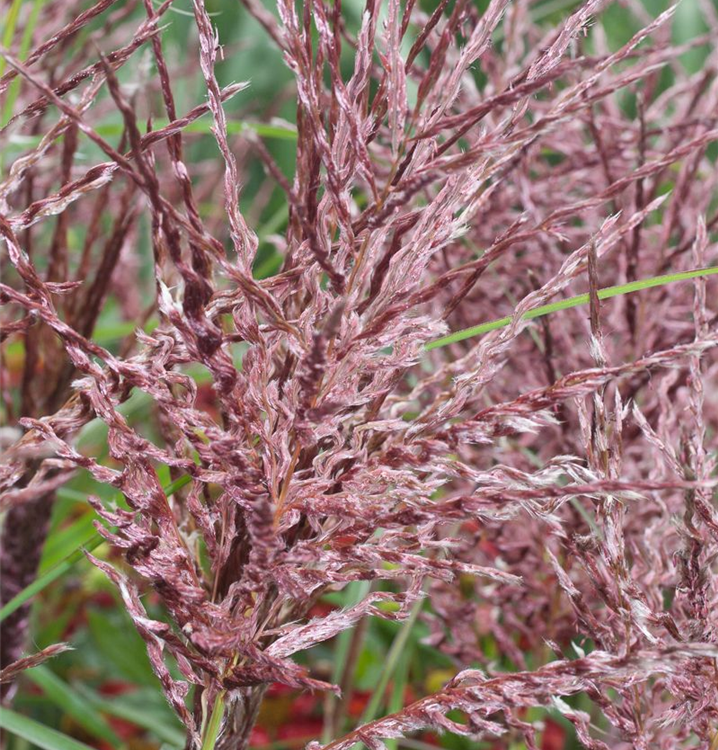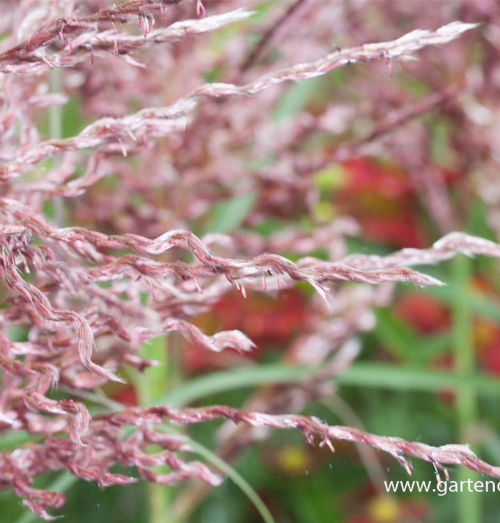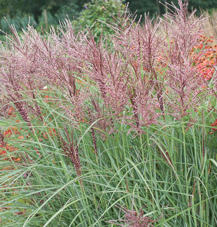 Die rot-braunen, gewellten Blüten des Garten-Chinaschilf 'Dread Locks' erscheinen in Rispen von August bis Oktober.