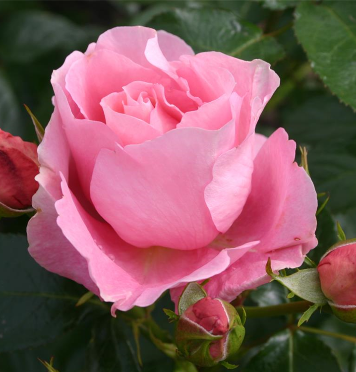 Die rosafarbenen, gefüllten, schalenförmigen Blüten der Beetrose 'Poetry'®(s) erscheinen in Dolden von Juni bis September. Diese werden etwa 6 - 7 cm groß und sind leicht duftend.