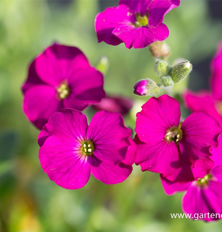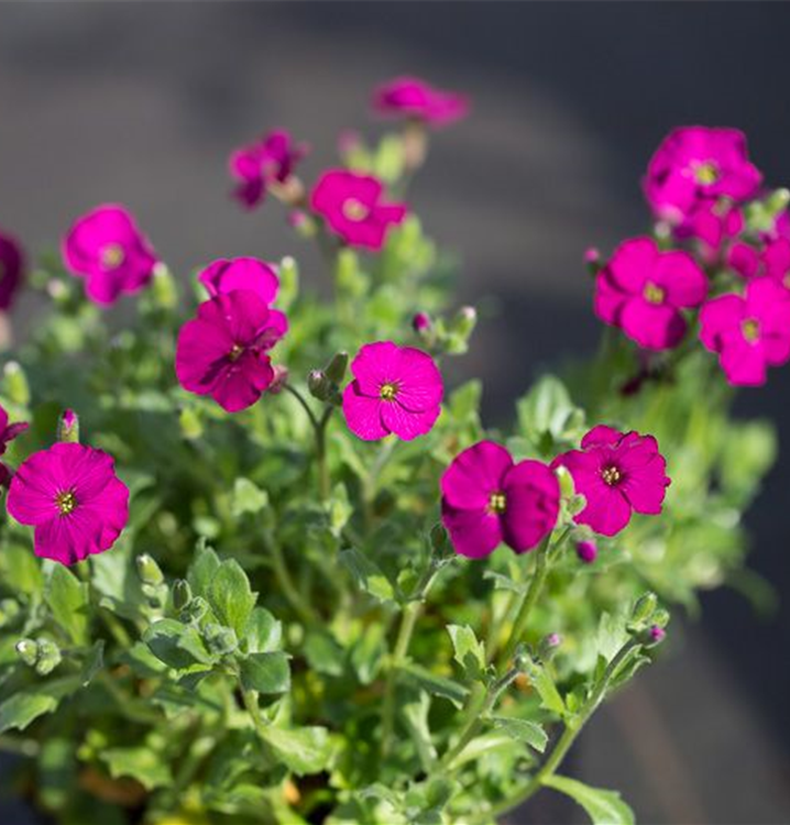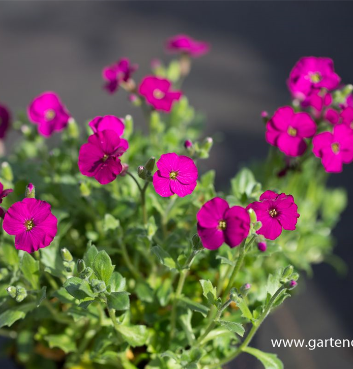 Aubrieta x cultorum 'Regado Red' bildet radförmige, purpurrote Blüten ab April.