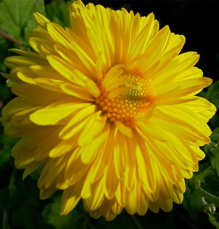 Chrysanthemum hortorum 'Citrus' bildet halbgefüllte, körbchenartige, strahlenförmige, zitronengelbe Blüten ab September.