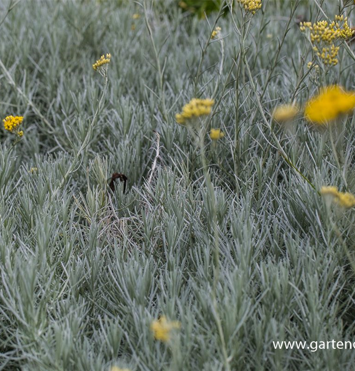 Das Currykraut 'Dwarf' (Helichrysum italicum) ist eine buschige, aufrechte wintergrüne Staude, die von Juli bis September gelbe, röhrenförmige, in Doldentrauben angeordnete Blüten bildet. An einem sonnigen Standort mit durchlässigem, nährstoffreichem Boden erreicht es gewöhnlich eine Höhe von ca. 40 cm und wird ca. 40 cm breit. Das Currykraut 'Dwarf' ist gut frostverträglich.