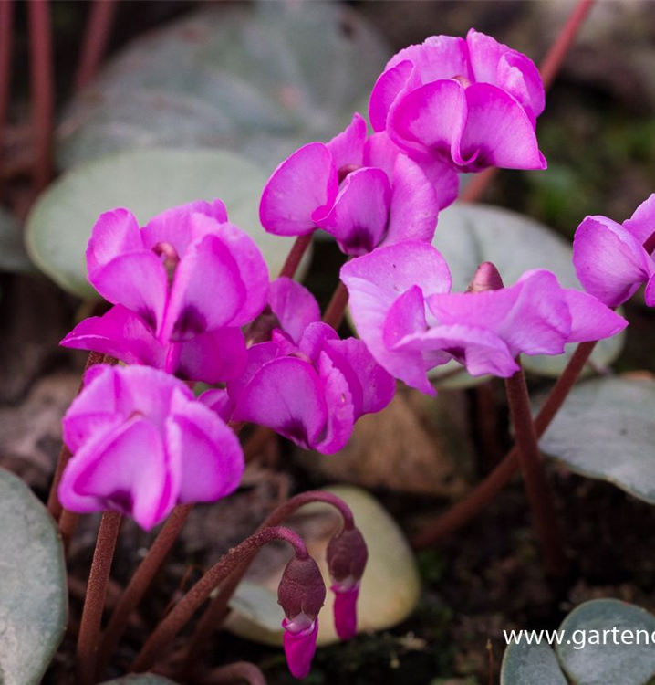 Das Frühlings-Alpenveilchen (Cyclamen coum) bringt ansehnliche, rosafarbene, angenehm duftende Blüten von Februar bis März hervor. Bevorzugt wird ein durchlässiger, humoser, nährstoffreicher Boden in halbschattiger Lage. Die aufrechte Staude erreicht gewöhnlich eine Höhe von 10 - 15 cm und wird bis zu 15 cm breit.