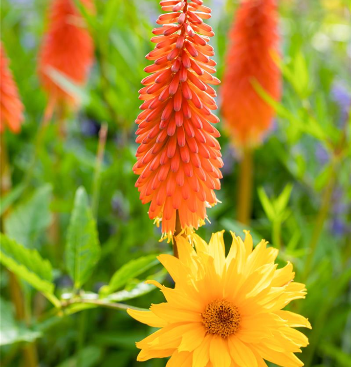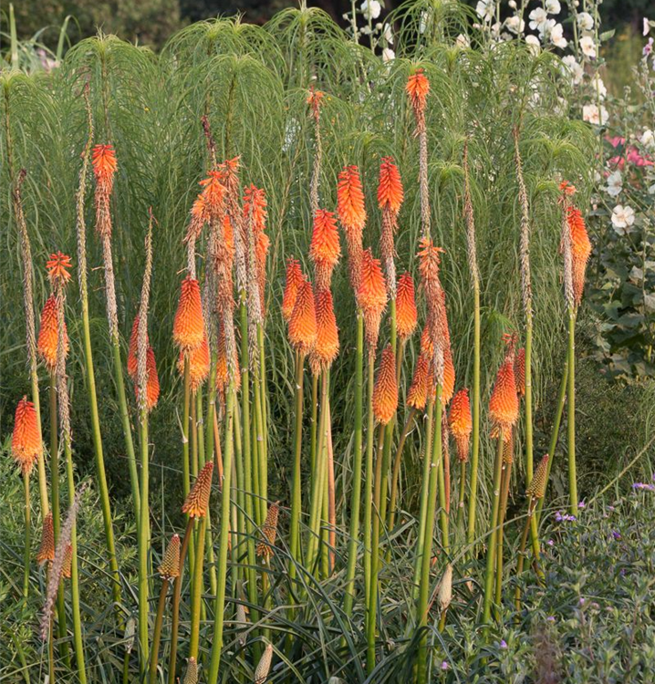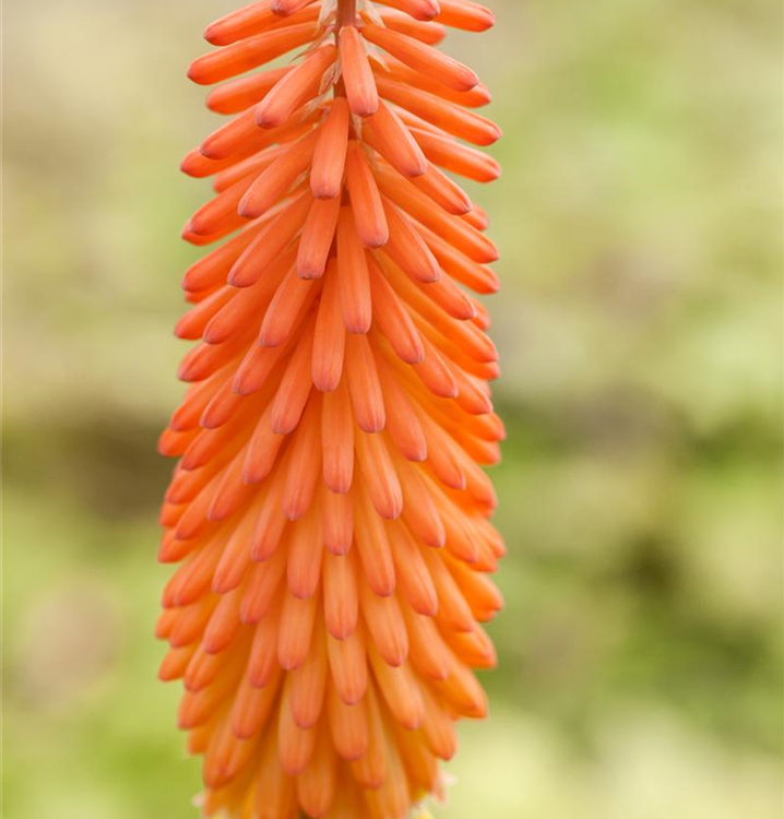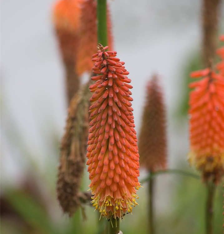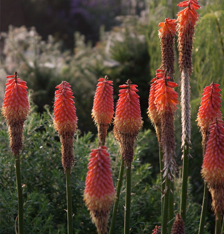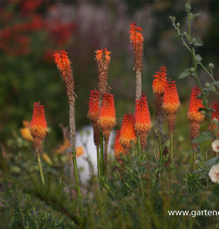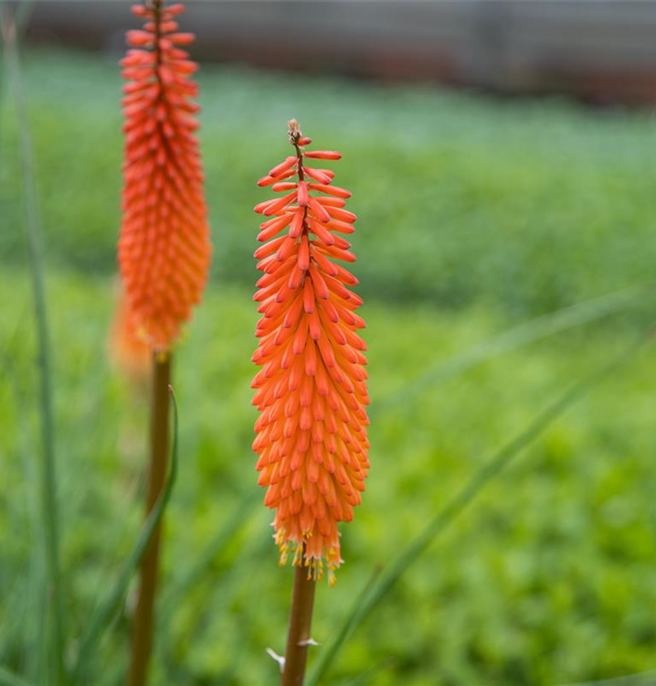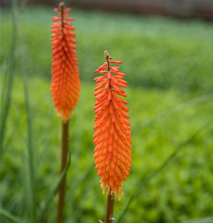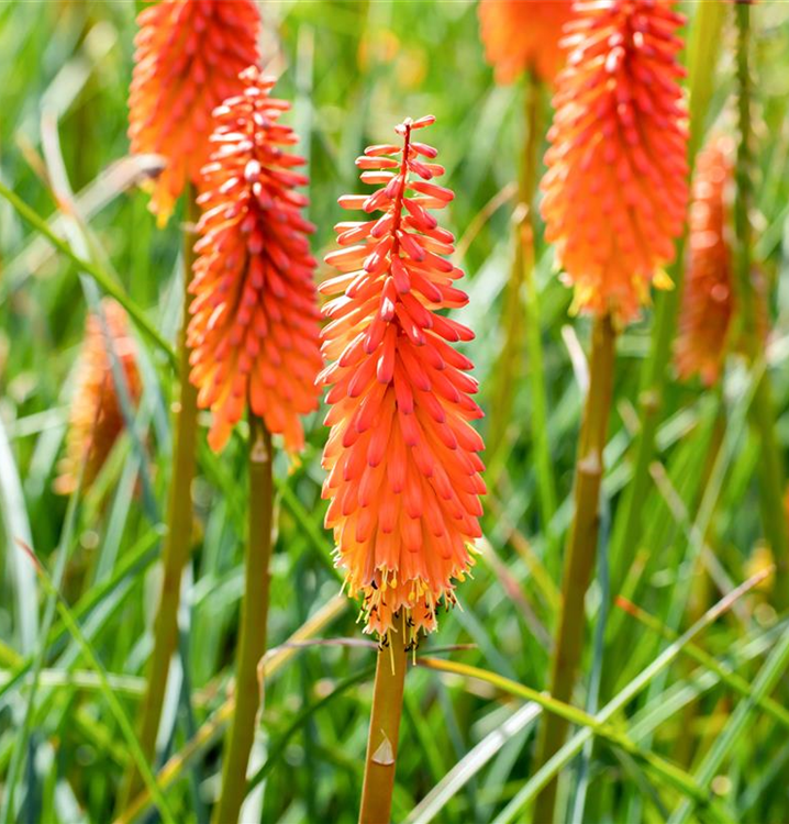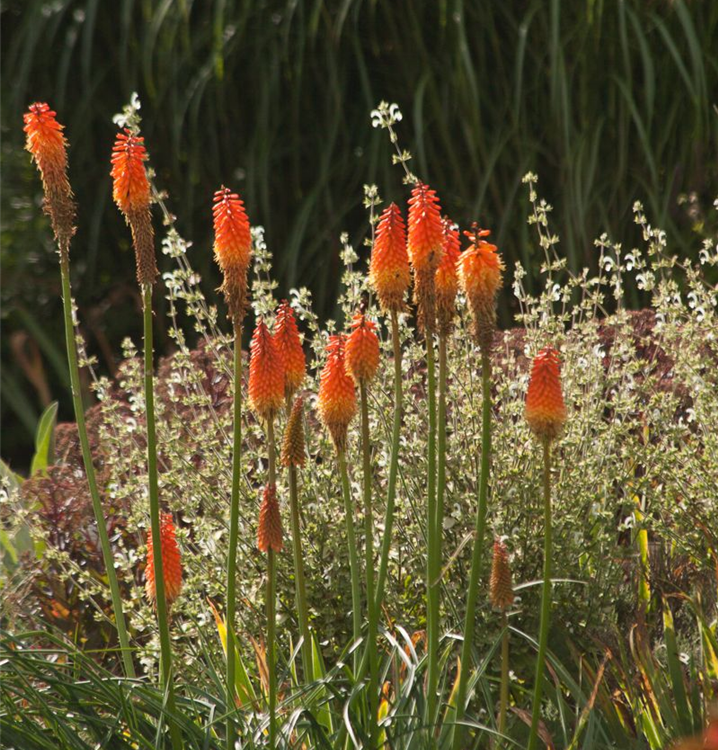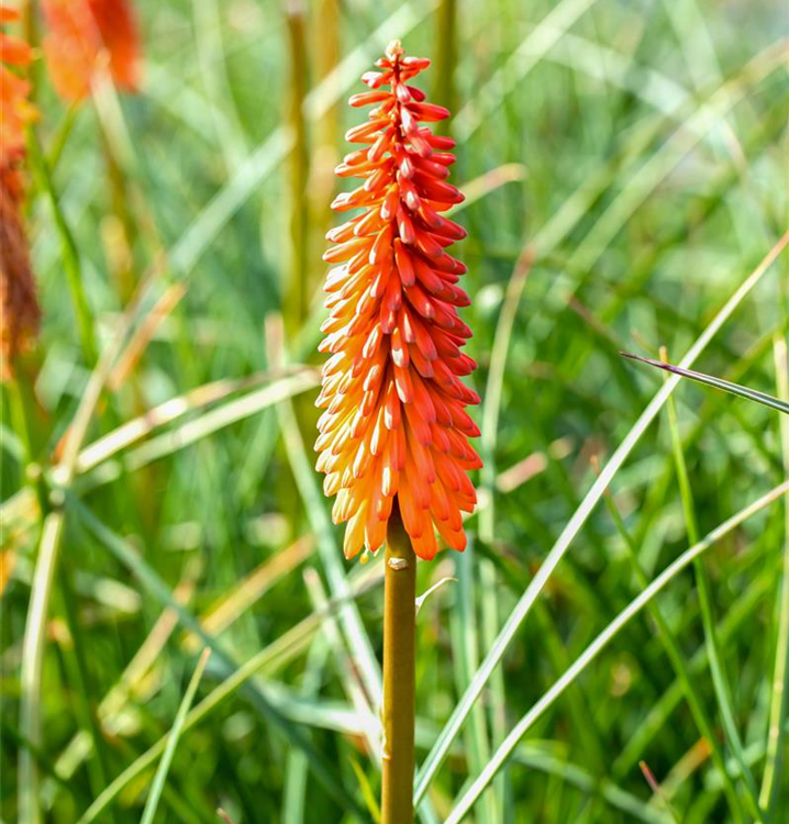 Kniphofia uvaria 'Alcazar' bildet in Kolben angeordnete, orange-rote Blüten ab Juli.