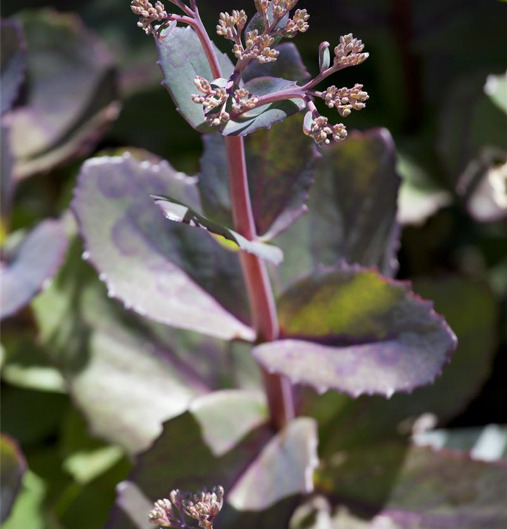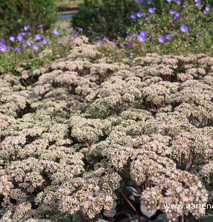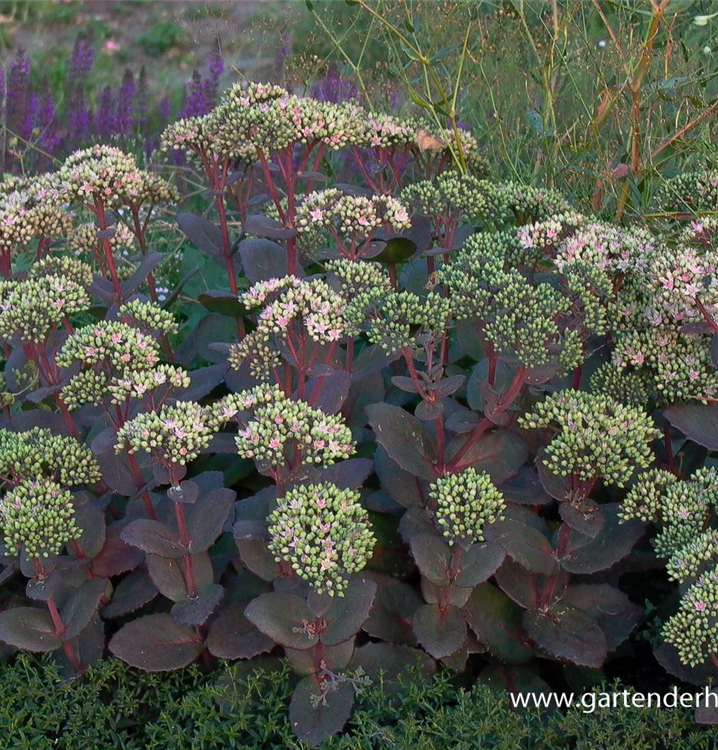 Das Große Garten-Fettblatt (Sedum hybridum) ist eine aufrechte, horstbildende immergrüne Staude, die von September bis Oktober rosafarbene, in Dolden angeordnete Blüten bildet. An einem sonnigen bis halbschattigen Standort mit durchlässigem, lockerem, nährstoffreichem, sandigem Boden erreicht es gewöhnlich eine Höhe von ca. 50 cm und wird ca. 40 cm breit. Das Große Garten-Fettblatt ist gut frostverträglich.
