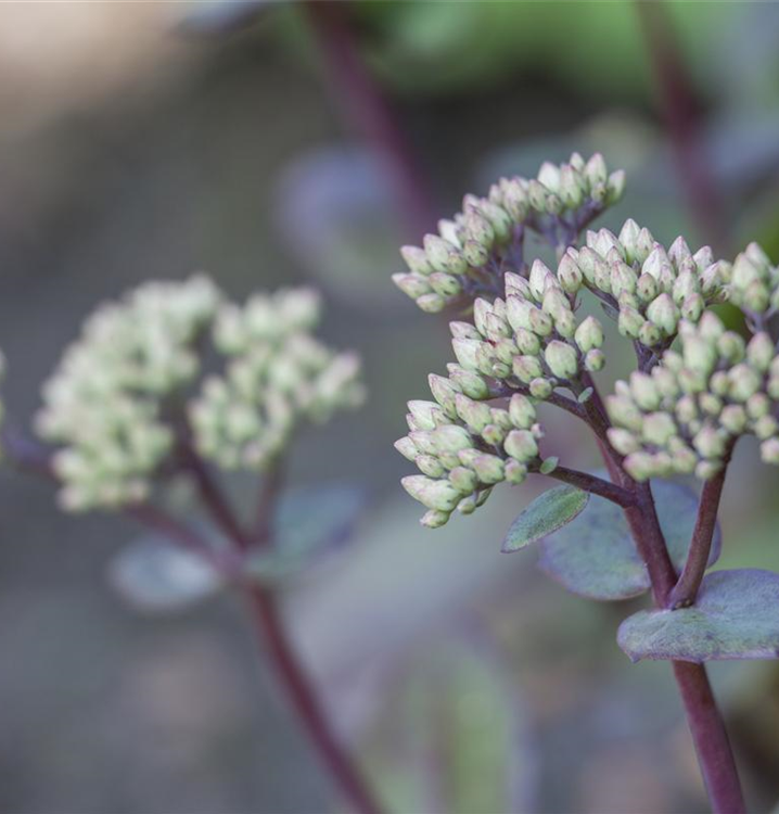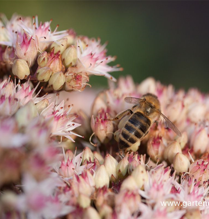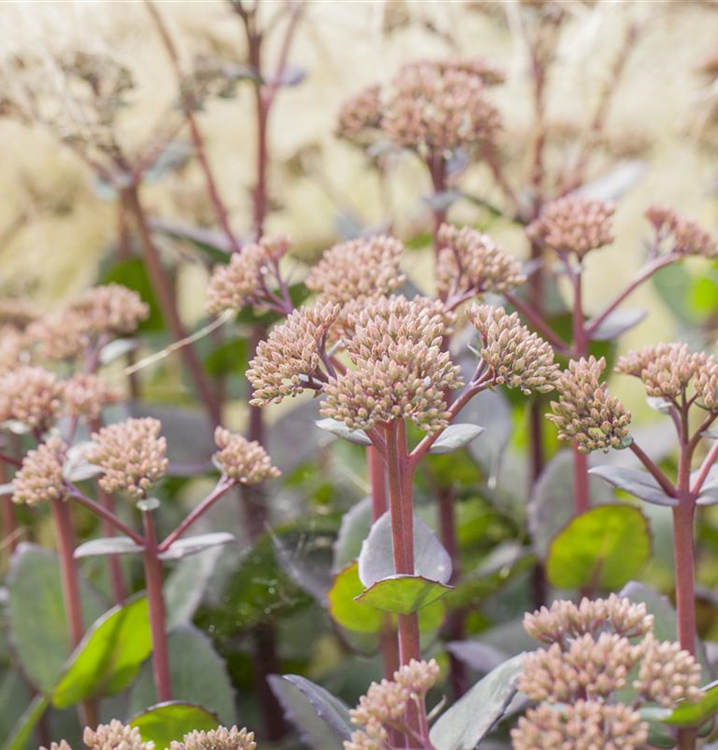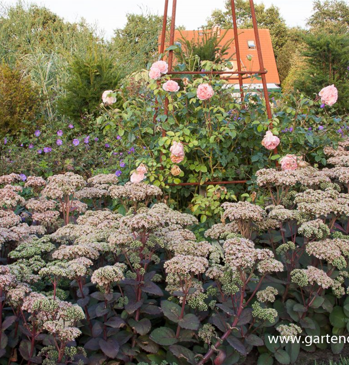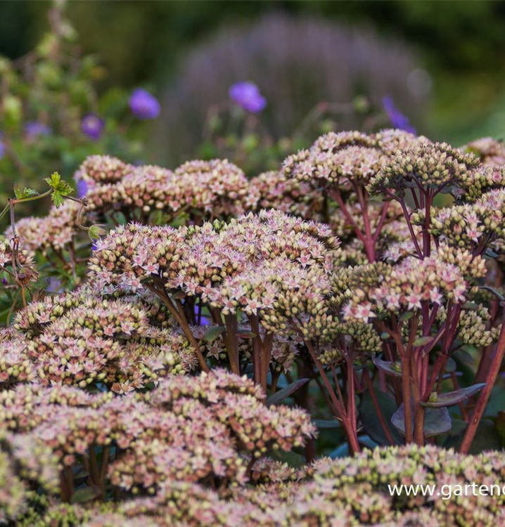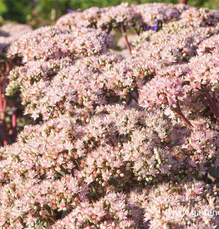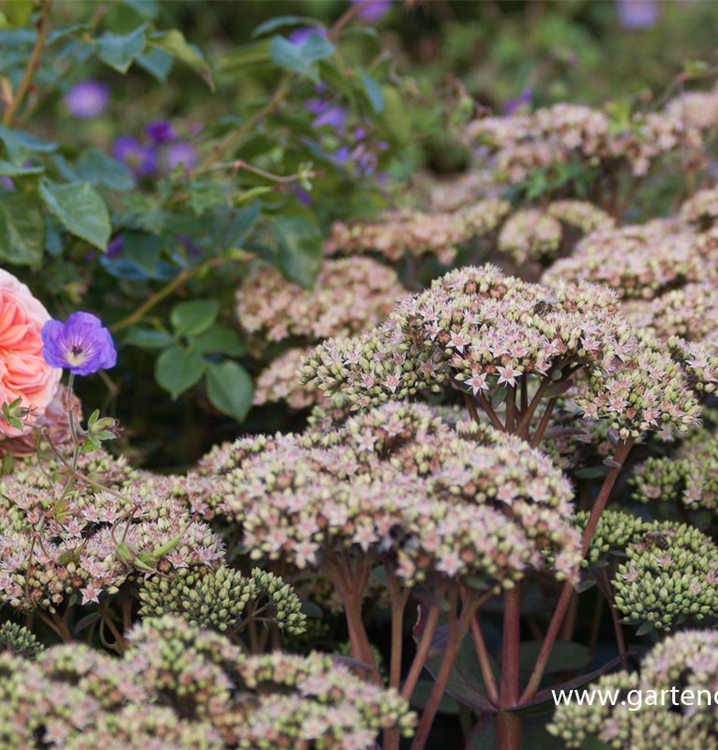 Sedum hybridum 'Matrona' bildet in Dolden angeordnete, rosafarbene Blüten ab September.
