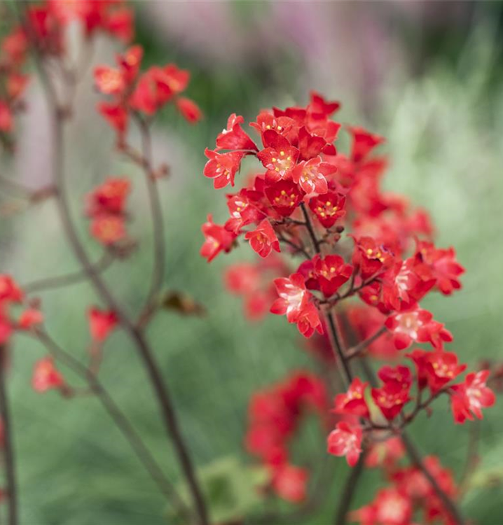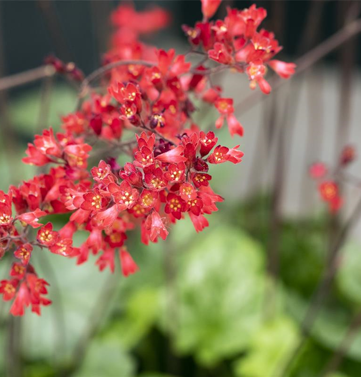 Heuchera sanguinea 'Ruby Bells' bildet dunkelrote Blüten ab Juni.