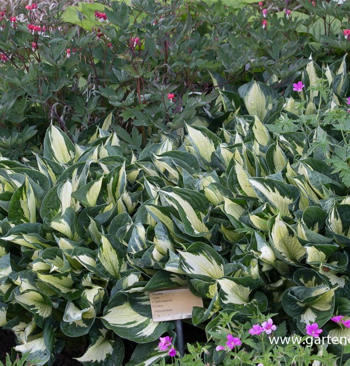 Die Grünrandige Garten-Funkie 'Whirlwind' (Hosta) ist eine horstbildende, buschige, breite Staude, die von Juni bis Juli lilafarbene, glockenförmige, in Rispen angeordnete Blüten bildet. An einem halbschattigen Standort mit durchlässigem, humosem Boden erreicht sie gewöhnlich eine Höhe von ca. 40 cm und wird ca. 50 cm breit. Die Grünrandige Garten-Funkie 'Whirlwind' ist gut frostverträglich.