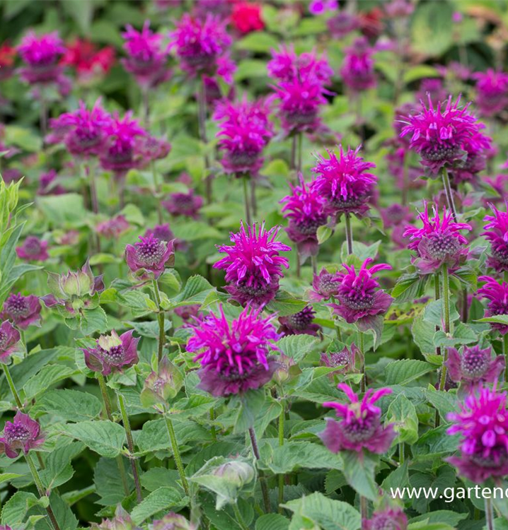 Monarda fistulosa 'Purple Ann' bildet lippenförmige, in Quirle angeordnete, purpurrote Blüten ab Juli.