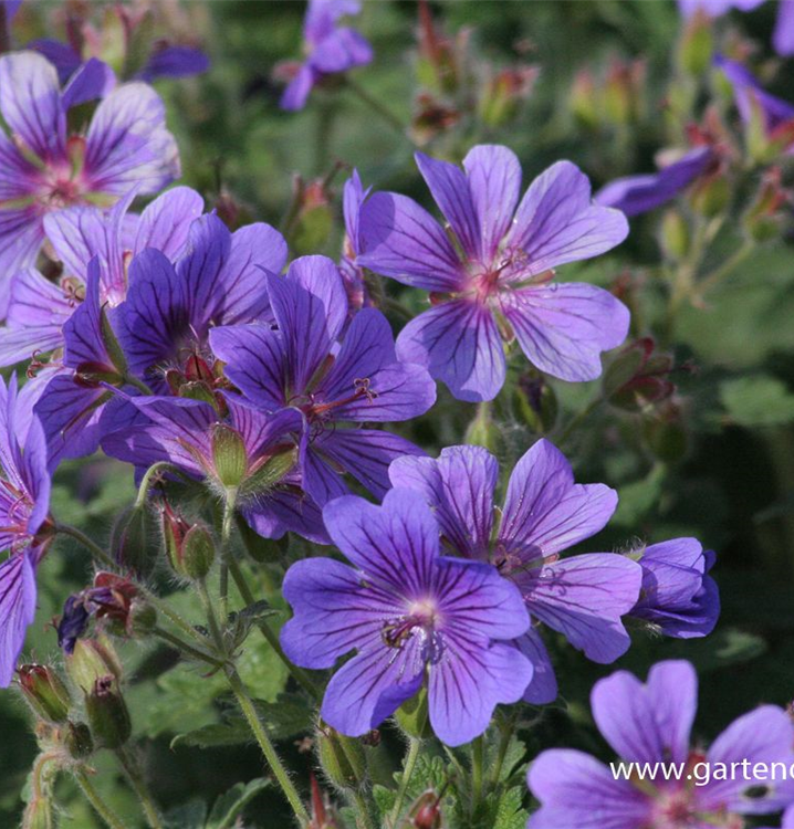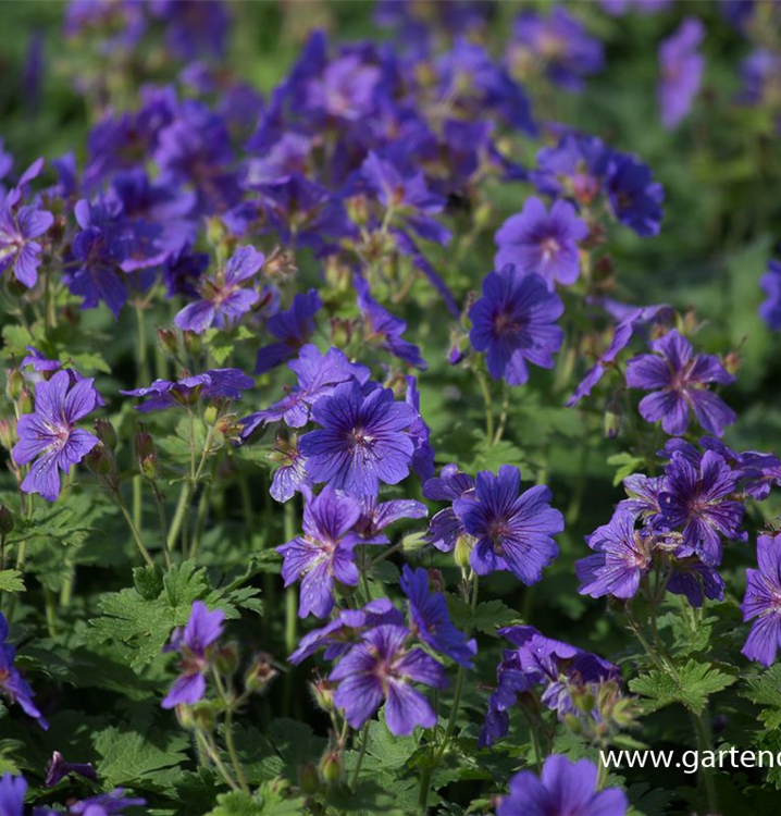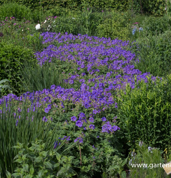 Geranium x magnificum 'Rosemoor' bildet schalenförmige, blauviolette Blüten ab Mai.