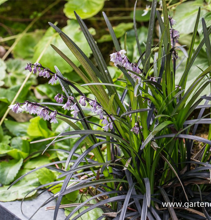 Ophiopogon planiscapus 'Niger' bildet in Trauben angeordnete, rosafarbene Blüten ab Juli.