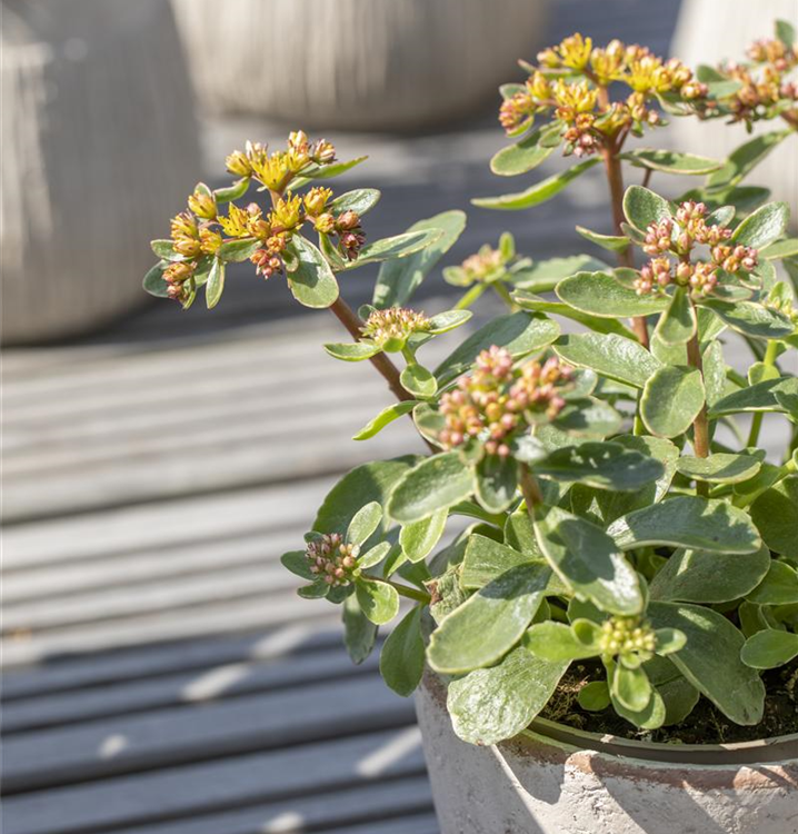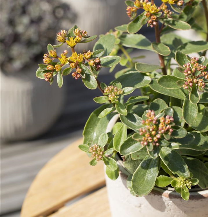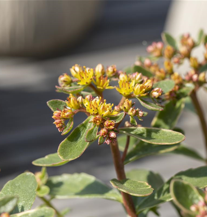 Sedum kamtschaticum 'Variegatum' bildet sternförmige, in Dolden angeordnete, gelbbunte Blüten ab Juli.
