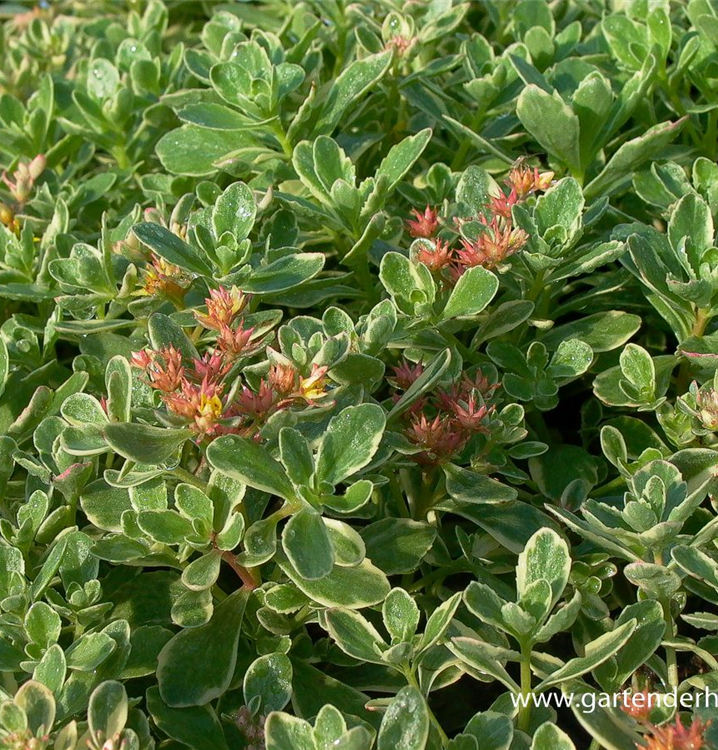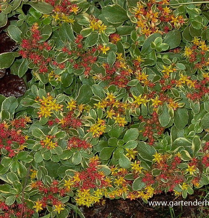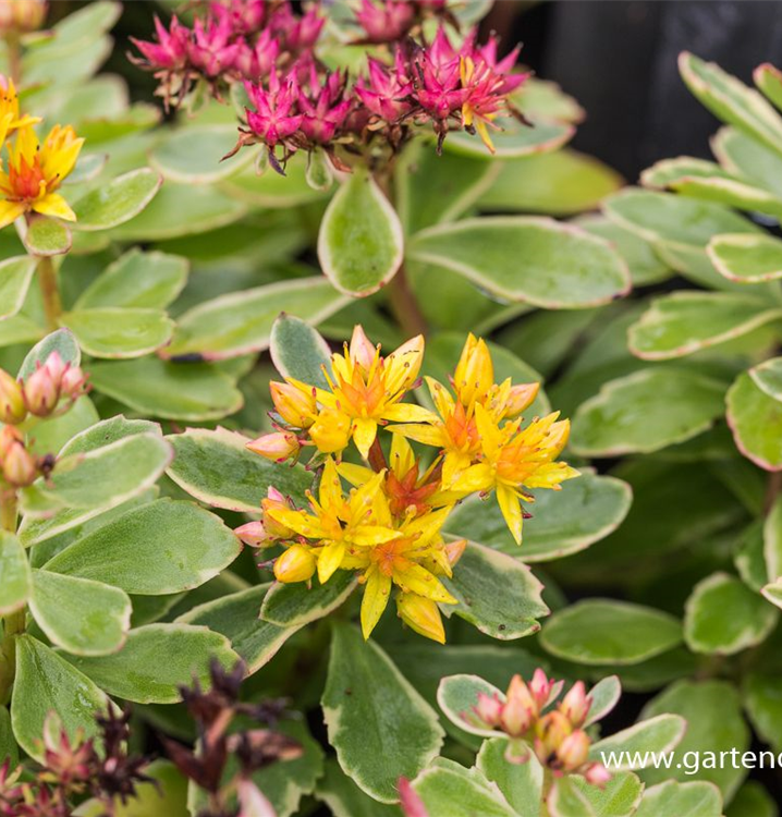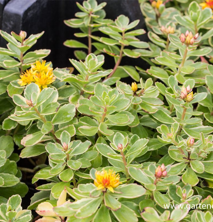 Das Buntlaubige Garten-Fettblatt (Sedum kamtschaticum) ist eine aufrechte wintergrüne Staude, die von Juli bis August gelbbunte, sternförmige, in Dolden angeordnete Blüten bildet. An einem sonnigen bis halbschattigen Standort mit durchlässigem, nährstoffreichem Boden erreicht es gewöhnlich eine Höhe von ca. 15 cm und wird ca. 30 cm breit. Das Buntlaubige Garten-Fettblatt ist gut frostverträglich.
