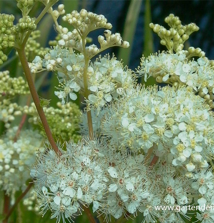 Das Sumpf-Mädesüß (Filipendula ulmaria) ist eine kriechende Staude, die von Juni bis August cremeweiße, in Rispen angeordnete Blüten mit einem angenehmen Duft bildet. An einem sonnigen bis halbschattigen Standort mit durchlässigem, humosem, lockerem, feuchtem bis nassem Boden erreicht es gewöhnlich eine Höhe von ca. 1,5 m und wird ca. 50 cm breit. Das Sumpf-Mädesüß ist gut frostverträglich.