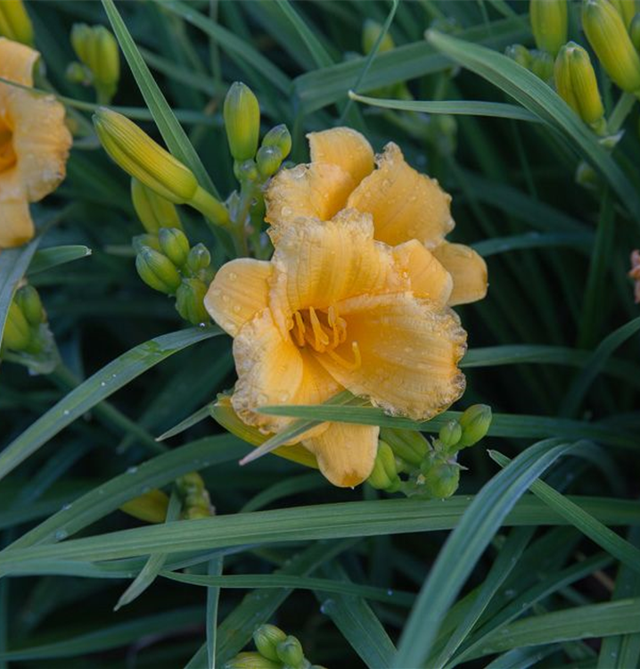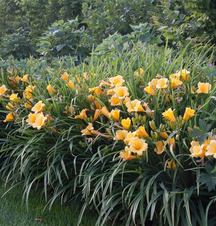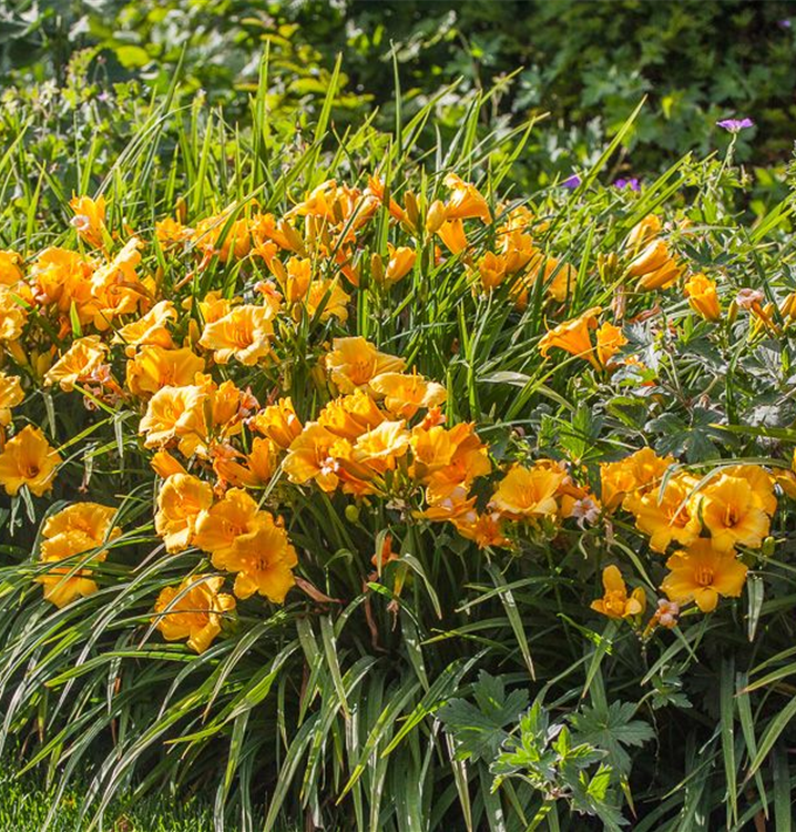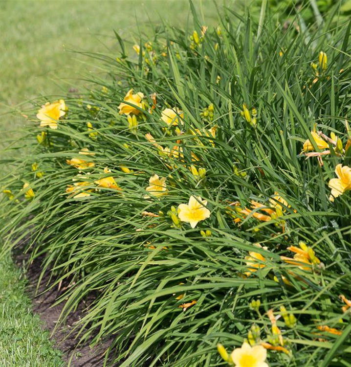 Die Garten-Taglilie 'Mini Stella' (Hemerocallis) ist eine aufrechte, horstbildende, kompakte Staude, die von Juni bis September goldgelbe, trichterförmige Blüten bildet. An einem sonnigen Standort mit durchlässigem, nährstoffreichem Boden erreicht sie gewöhnlich eine Höhe von ca. 30 cm und wird ca. 50 cm breit. Die Garten-Taglilie 'Mini Stella' ist gut frostverträglich.