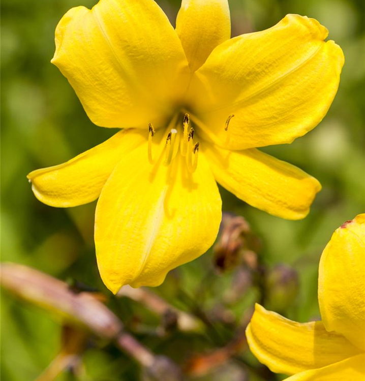 Hemerocallis 'Mini Stella' bildet trichterförmige, goldgelbe Blüten ab Juni.