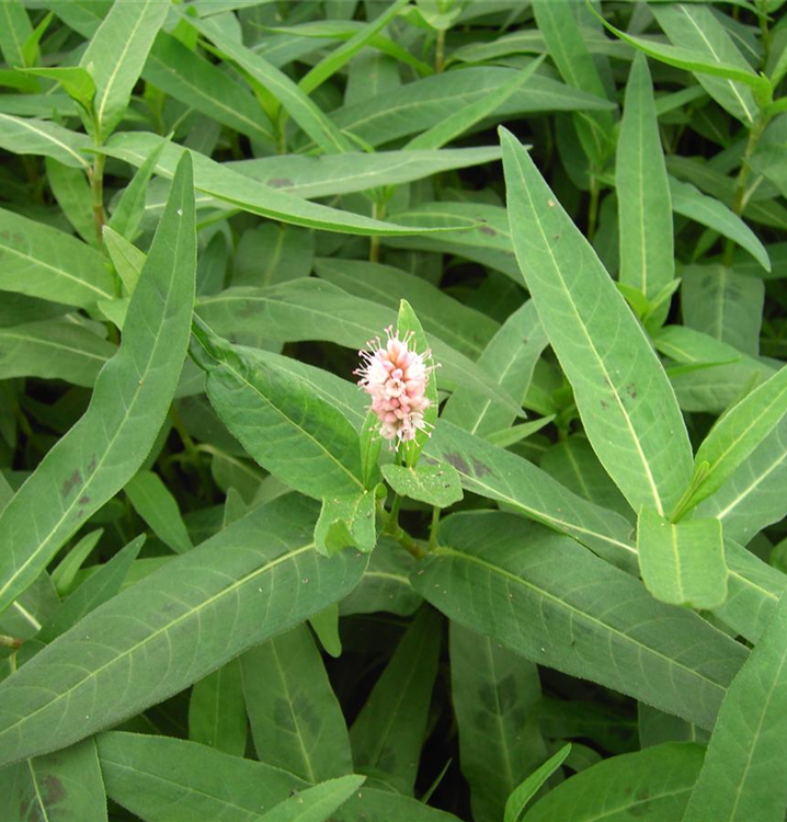 Die sommergrünen Blätter des Wasser-Knöterichs sind dunkelgrün, lanzettlich.