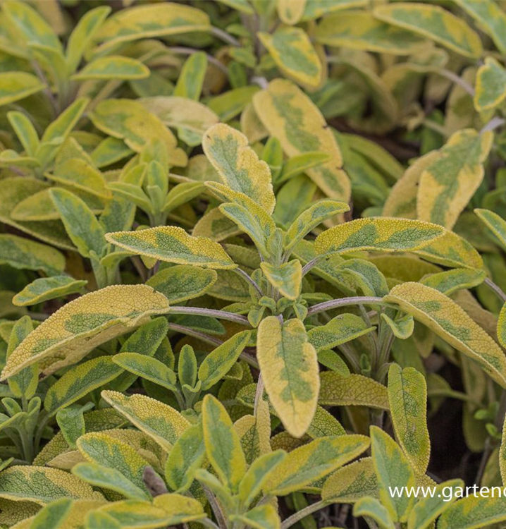 Zum Verzehr geeignet. Hoher Blattschmuckwert. Die wintergrünen Blätter des Buntblättrigen Garten-Salbeis sind grau-grün, eiförmig, ganzrandig und weisen einen gelben Rand auf. Sie verströmen einen angenehmen Duft.