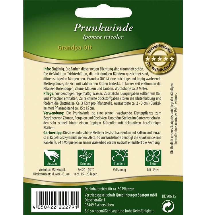 Trichterwinde 'Grandpa Ott' ist ein Klettergehölz, welches eine Höhe von 1 - 2 m und eine Breite von 0,5 - 1 m erreichen kann.