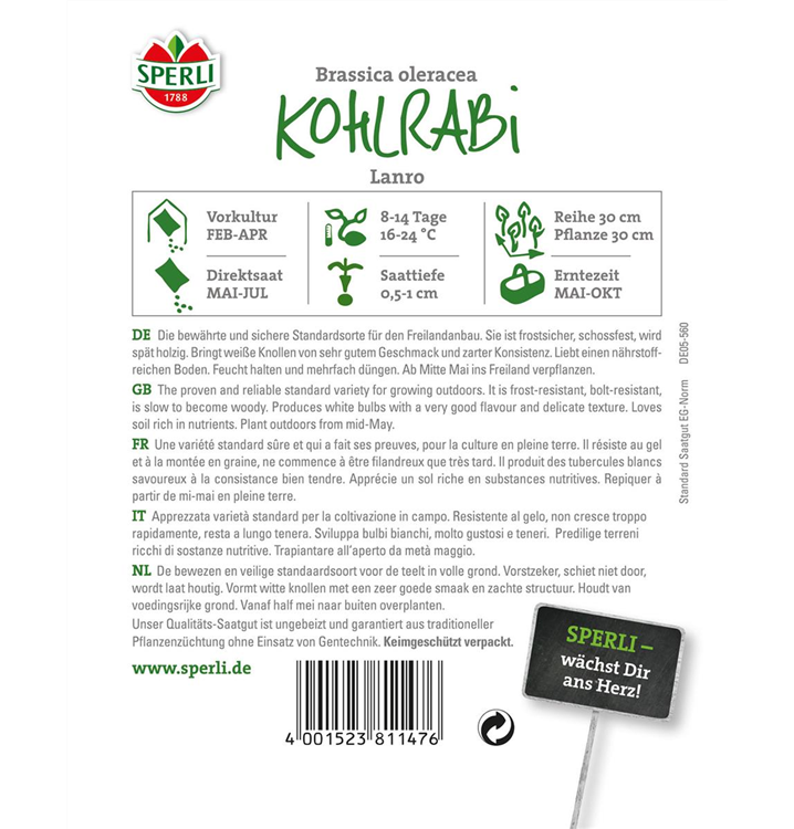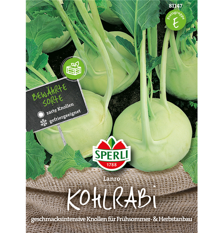 Der Kohlrabi 'Lanro' (Brassica oleracea var. gongylodes) bildet Knollen, die aromatisch schmecken und bereits ab Mai geerntet werden können. Für das optimale Wachstum des Kohlrabis 'Lanro' werden ein sonniger Standort und durchlässiger, nährstoffreicher Boden benötigt.