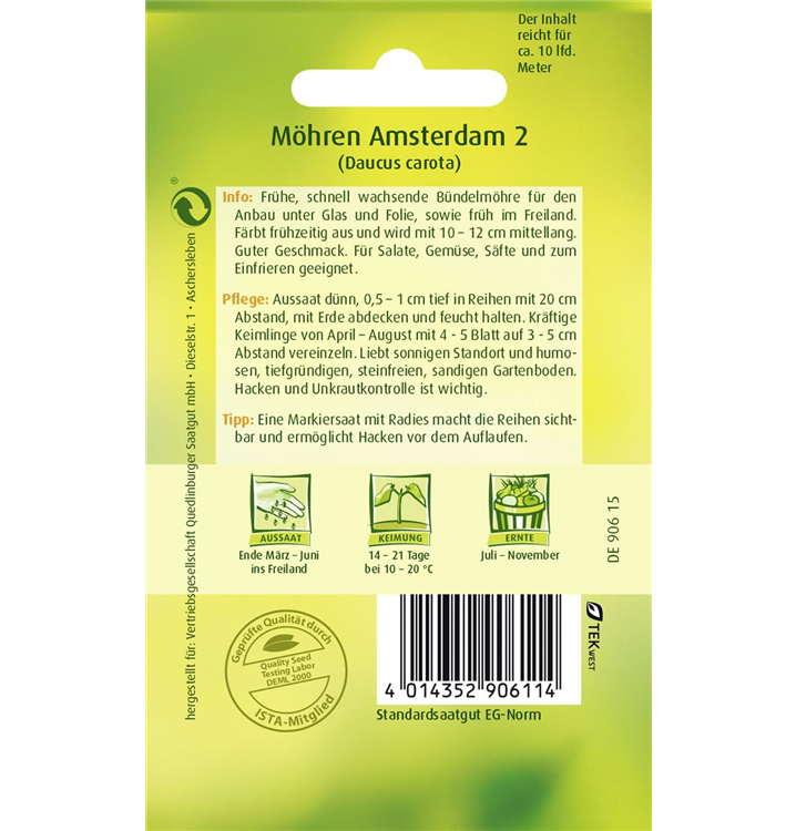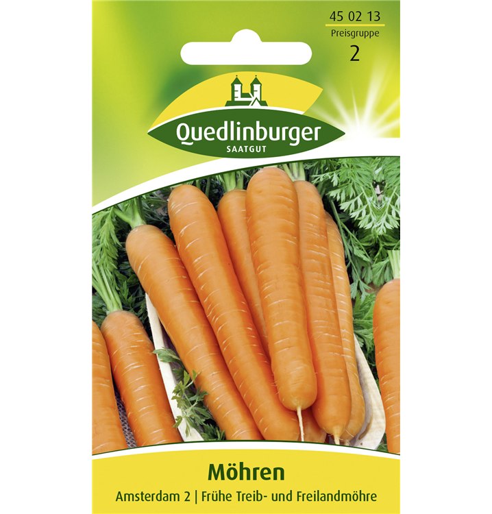 Die Möhre 'Amsterdam 2' (Daucus carota var. sativus) bildet Wurzeln, die aromatisch schmecken und bereits von Juli bis September geerntet werden können. Für das optimale Wachstum der Möhre 'Amsterdam 2' werden ein sonniger Standort und durchlässiger, nährstoffreicher Boden benötigt.