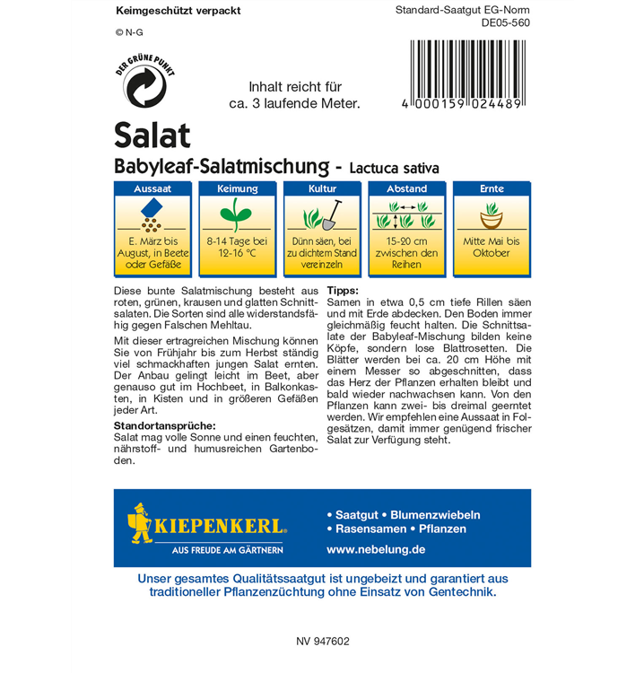 Der Babyleaf-Salat (Lactuca sativa) ist eine aromatisch, nussig, bitter schmeckende Gemüsepflanze. Seine Blätter können geerntet werden, sobald er ca. 20 erreicht hat. Für das optimale Wachstum des Babyleaf-Salats werden ein sonniger Standort und durchlässiger, nährstoffreicher Boden benötigt.