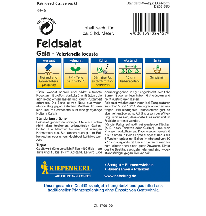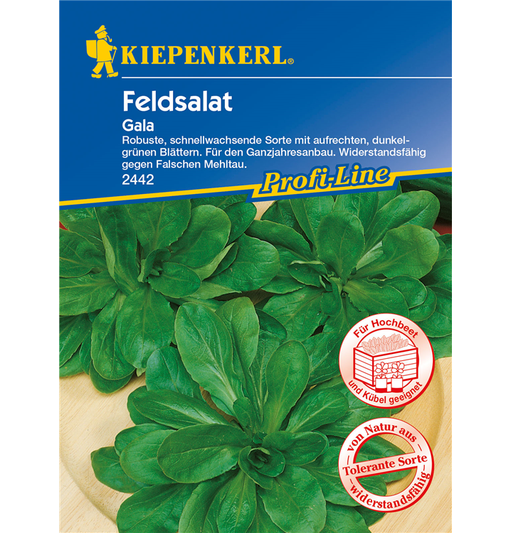 Der Feldsalat 'Gala' (Valerianella locusta) ist eine aromatisch, nussig schmeckende Gemüsepflanze. Seine Blätter können geerntet werden, sobald er ca. 10 erreicht hat. Für das optimale Wachstum des Feldsalats 'Gala' werden ein sonniger Standort und durchlässiger, nährstoffreicher Boden benötigt.