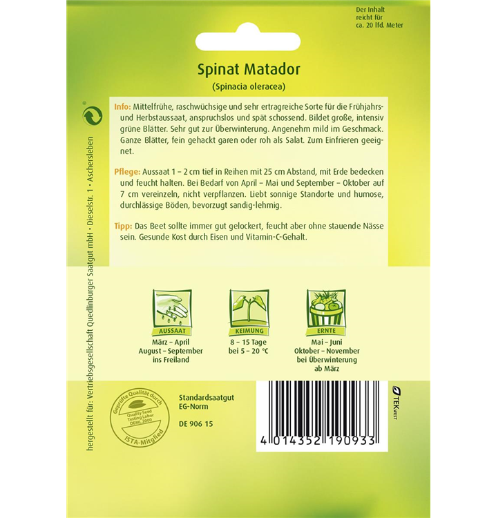 Der Echte Spinat 'Matador' (Spinacia oleracea) ist eine aromatisch schmeckende Gemüsepflanze. Seine Blätter können geerntet werden, sobald er ca. 20 erreicht hat. Für das optimale Wachstum des Echten Spinats 'Matador' werden ein sonniger Standort und durchlässiger, nährstoffreicher Boden benötigt.