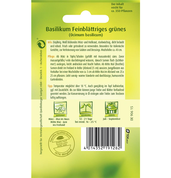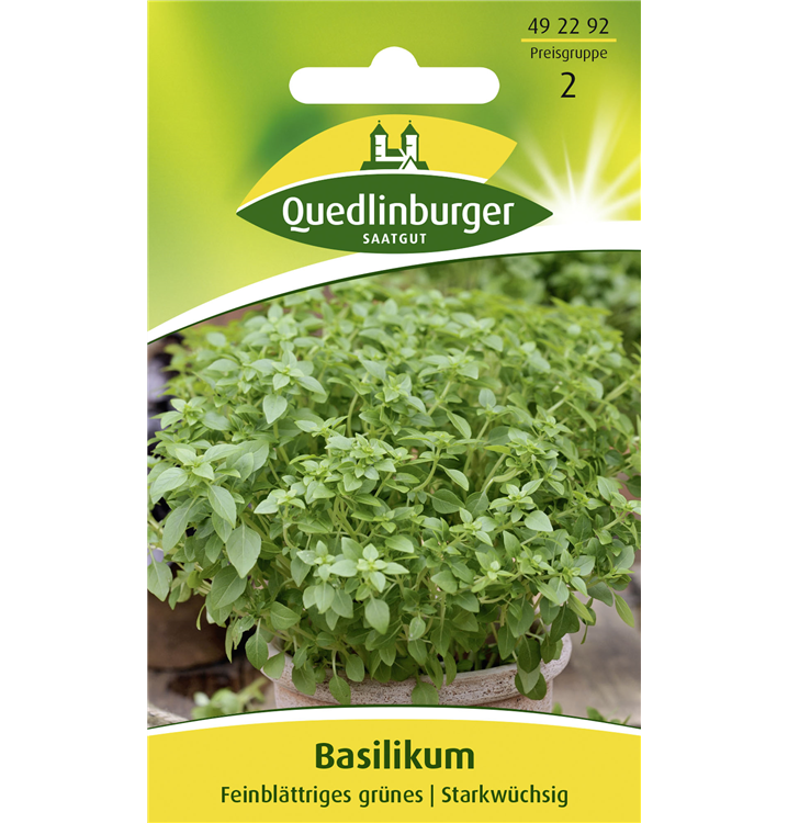 Das Garten-Basilikum 'Feinblättriges Grünes' (Ocimum basilicum) ist eine Kräuterpflanze mit einem würzigen Geschmack. Seine mittelgrünen Blätter sind spitz eiförmig und gewellt. Für das optimale Wachstum des Garten-Basilikums 'Feinblättriges Grünes' werden ein sonniger Standort und durchlässiger, nährstoffreicher Boden benötigt.