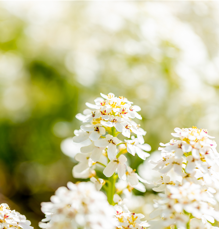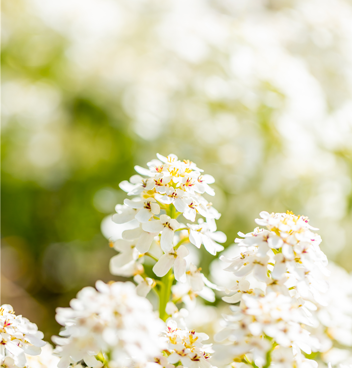 Iberis sempervirens 'Fischbeck' bildet in Dolden angeordnete, weiße Blüten ab April. Diese werden etwa 3 - 4 cm groß.